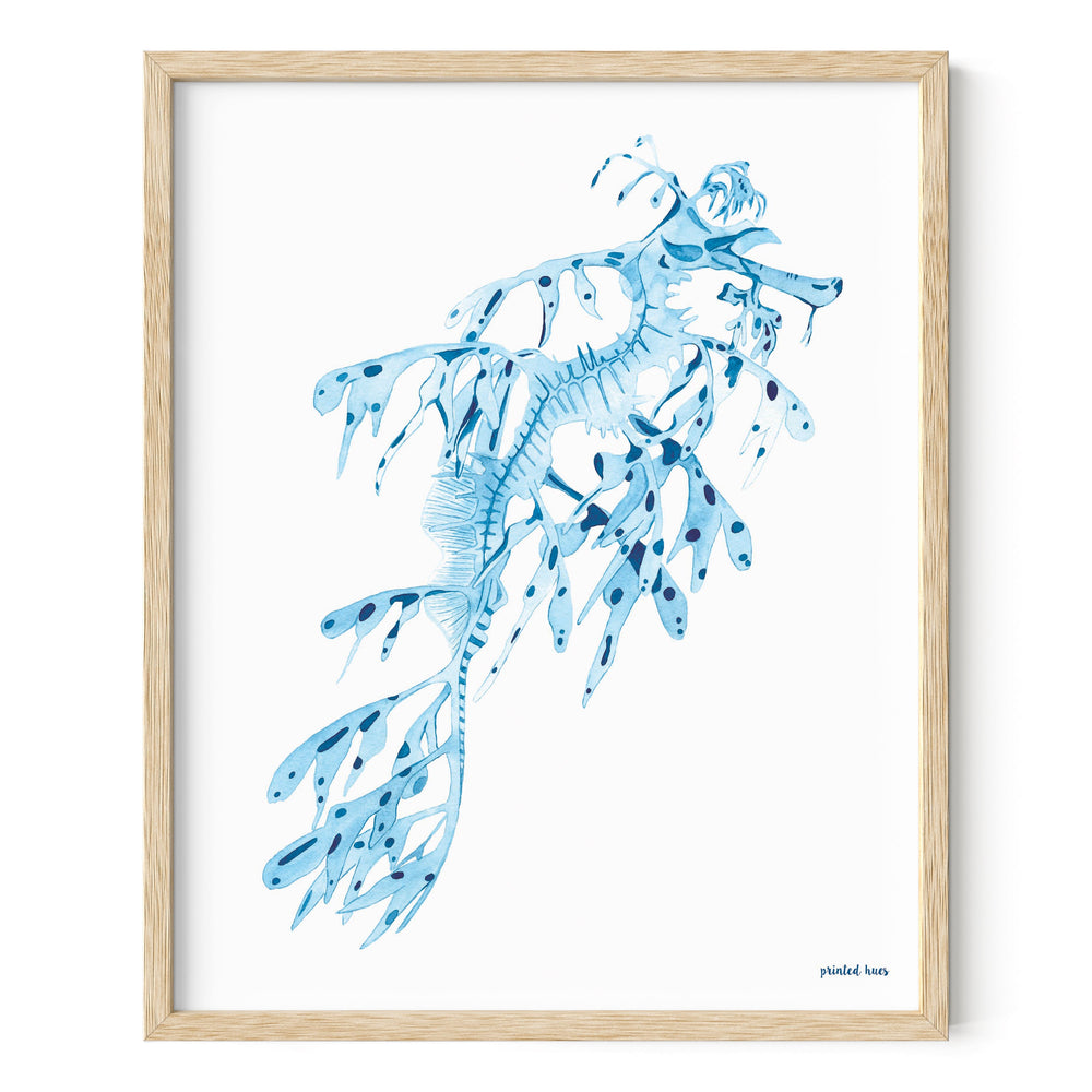 Blue and white never goes out of style. The All Blues Leafy Sea Dragon is painted in classic blue watercolor. Reproduced on beautiful, thick cotton paper, this giclee print looks like an original watercolor painting. Mixes and matches perfectly with the rest of the All Blues Collection.
