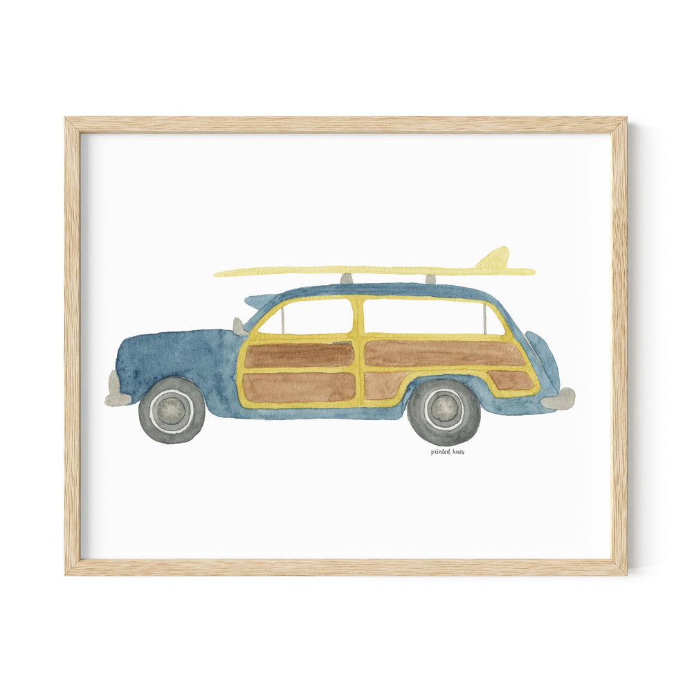 The Surf Truck Print is a professional reproduction of my original watercolor painting, inspired by vintage vehicles carrying surfboards.