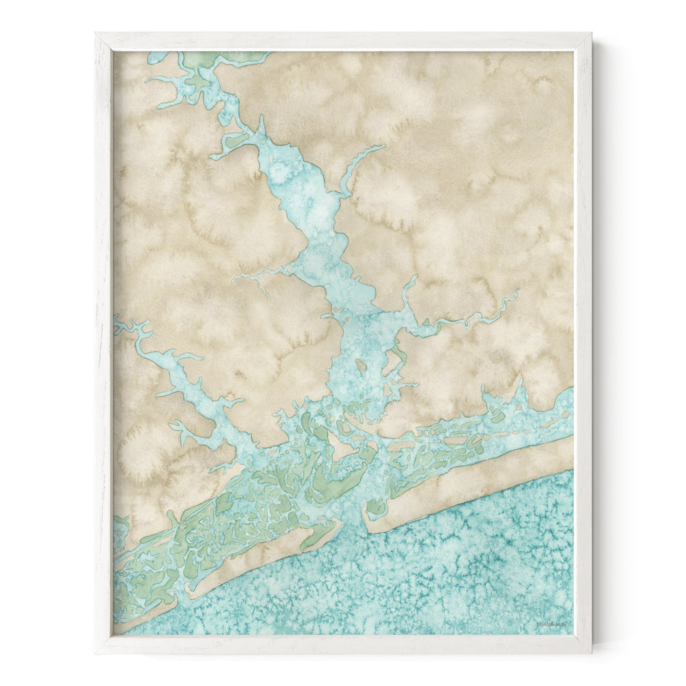 A watercolor giclee print of White Oak River, Swansboro and Bear Island, North Carolina. Reproduced on high quality, acid-free cotton paper with archival inks for lasting color.