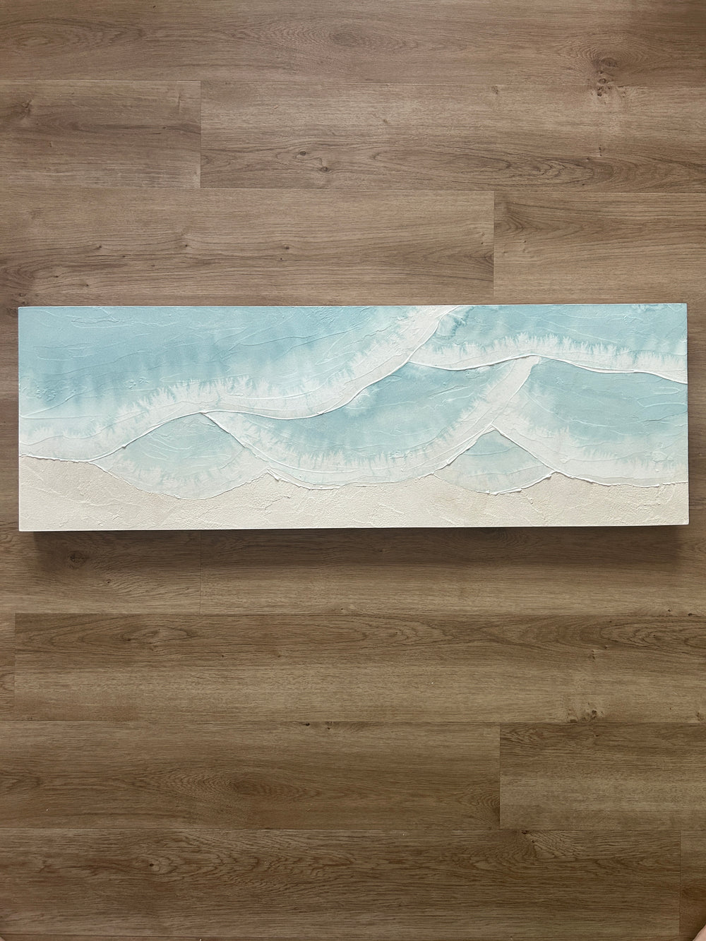 This painting, Tidal Reaches, measures 12x36 inches and is 1.5 inches deep. Wired on the back for easy hanging. Signed and titled on the back.