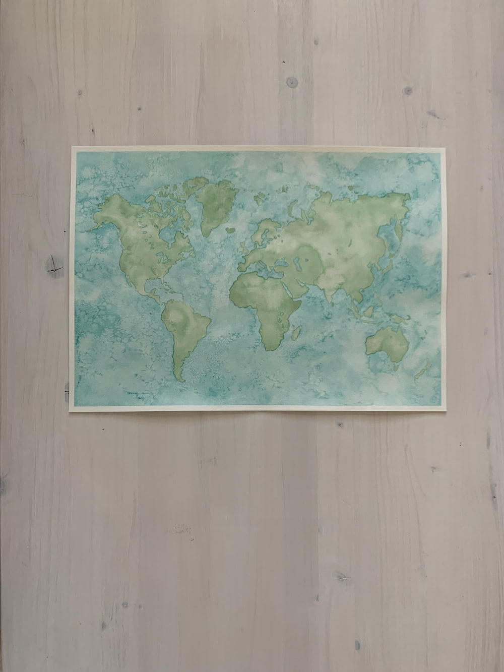Original watercolor painting of the world. Painted on 140 lb. cold press Canson watercolor paper, painting measures 11.25x16.25 inches with an additional quarter inch border of white paper. Painting will be signed across the bottom right edge of the painting prior to shipping.