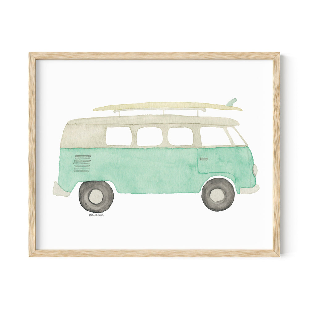 The Surf Truck Print is a professional reproduction of my original watercolor painting, inspired by vintage vehicles carrying surfboards.
