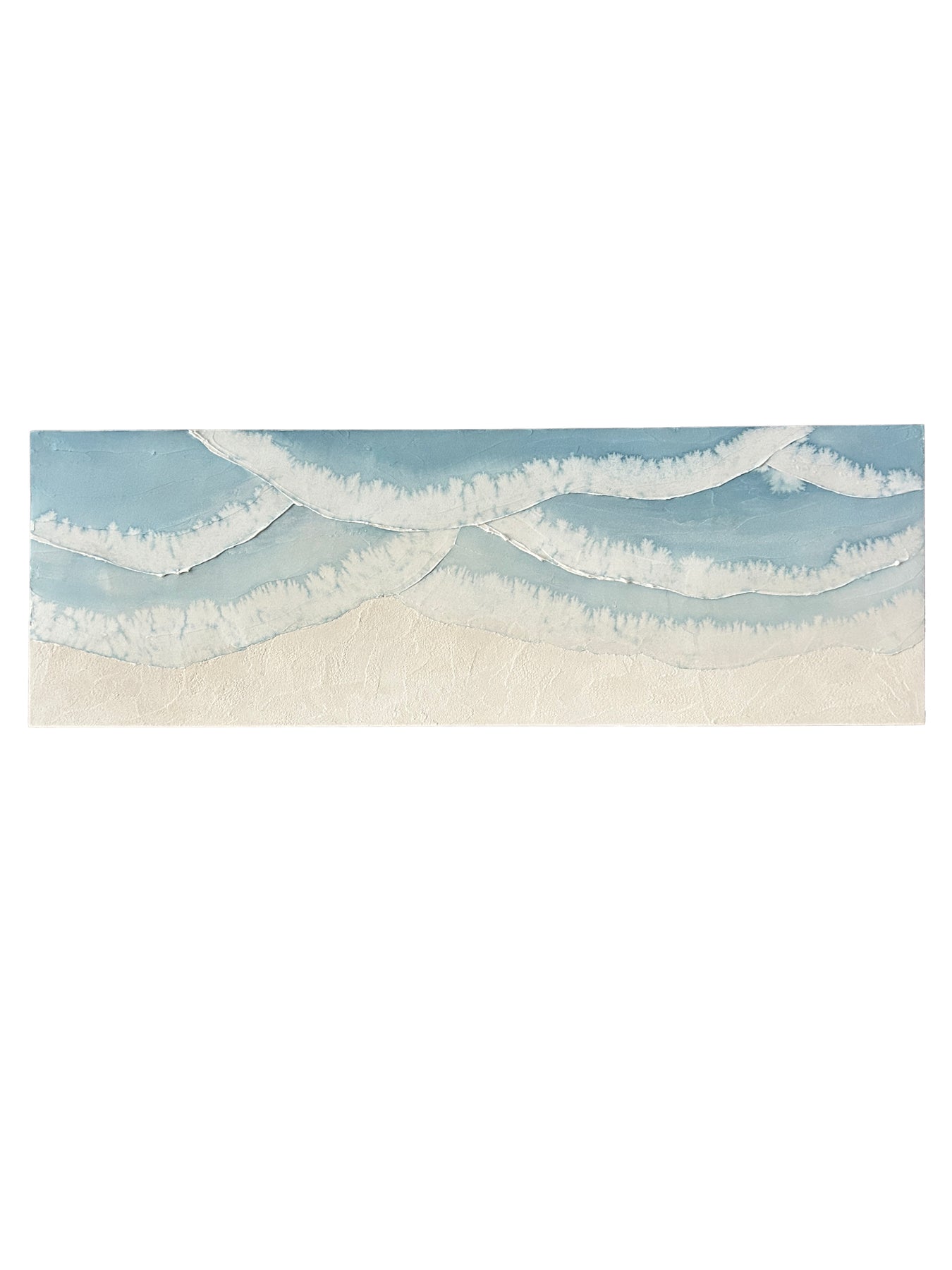 This painting, Tideline, measures 12x36 inches and is 1.5 inches deep. Wired on the back for easy hanging. Signed and titled on the back.