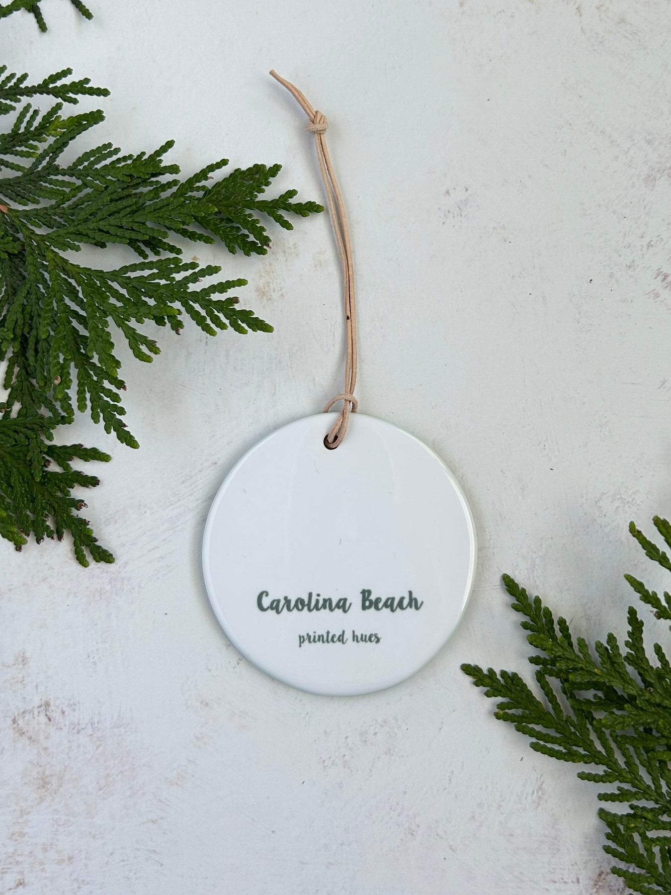 Ceramic ornament printed with the Coastal Watercolor Map of Carolina Beach, North Carolina. The back reads "Carolina Beach" above the Printed Hues logo. Each ornament is strung with a leather cord and individually boxed. Ornaments measure 3 inches in diameter.