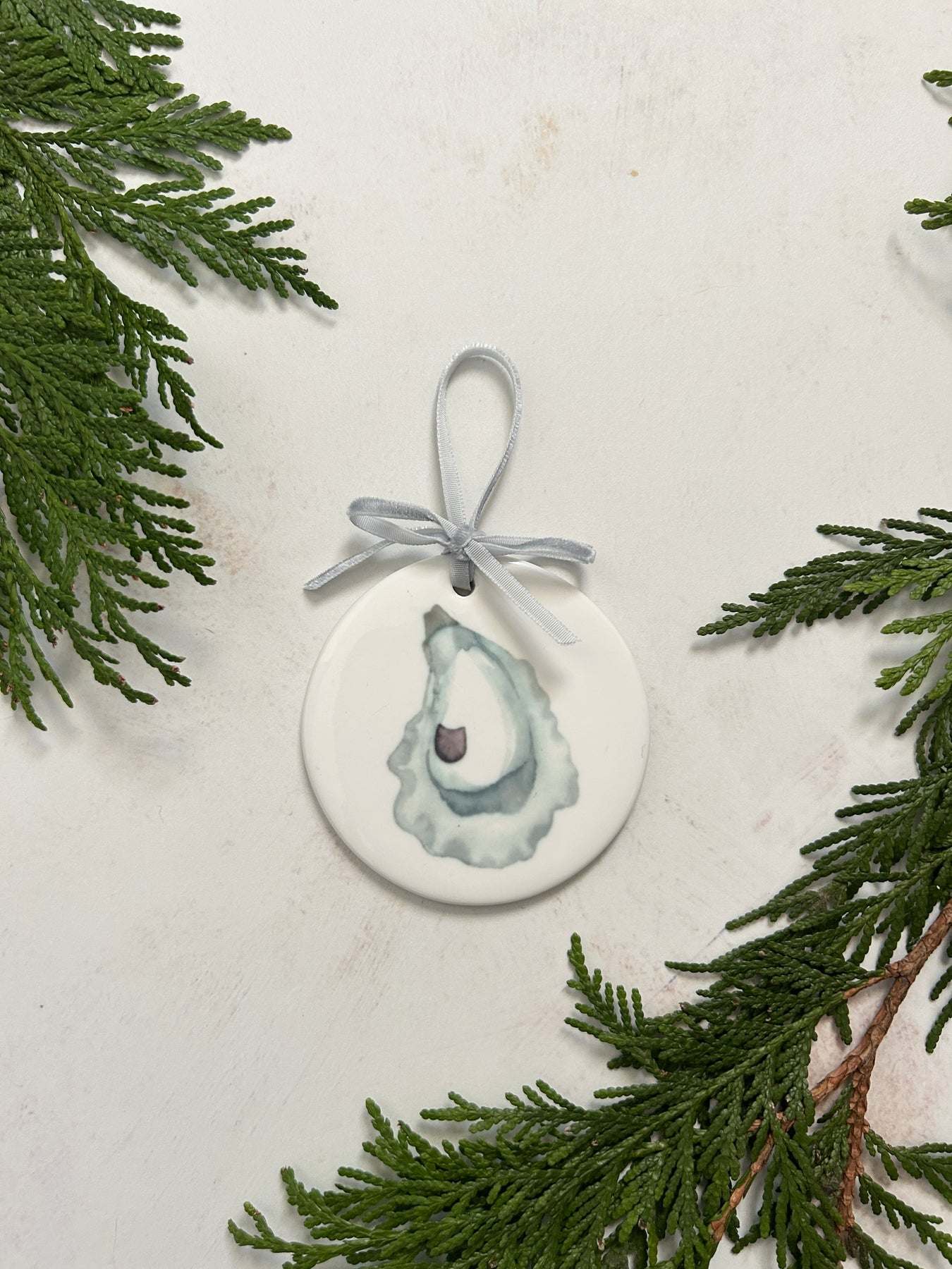 Ceramic ornament printed with our watercolor Carolina Oyster. The back reads "the world is your oyster" in watercolor script above a small Printed Hues logo. Each ornament is strung with a light blue velvet ribbon and individually boxed. Ornaments measure 3 inches in diameter.