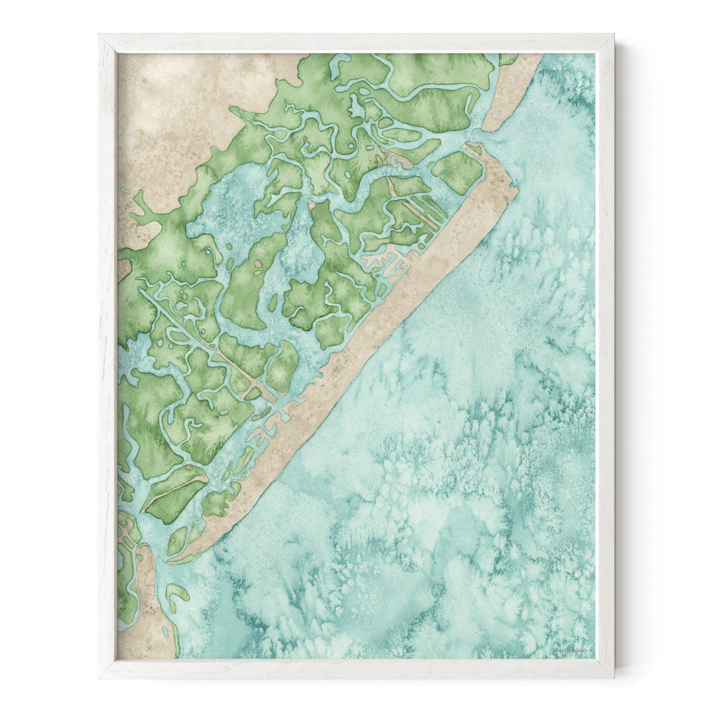 A watercolor giclee print of 7 Mile Island, New Jersey, including the towns of Stone Harbor and Avalon. Reproduced on high quality, acid-free cotton paper with archival inks for lasting color.