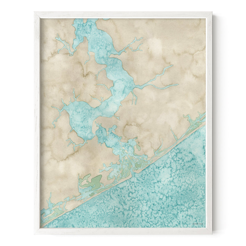 A watercolor giclee print of he New River Inlet in North Carolina. Reproduced on high quality, acid-free cotton paper with archival inks for lasting color.