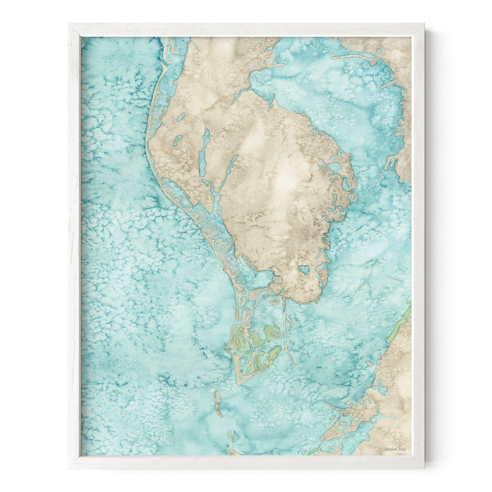 A watercolor giclee print of Pinellas County, Florida. Reproduced on high quality, acid-free cotton paper with archival inks for lasting color.