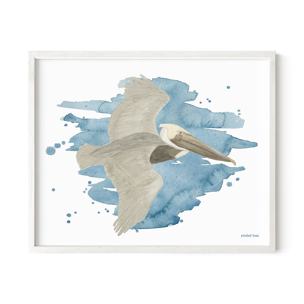 A soaring pelican glides over an abstract blue watercolor wash. Reproduced on beautiful, thick cotton paper, this giclee print looks like an original watercolor painting. Mixes and matches perfectly with the rest of the Bird Collection.