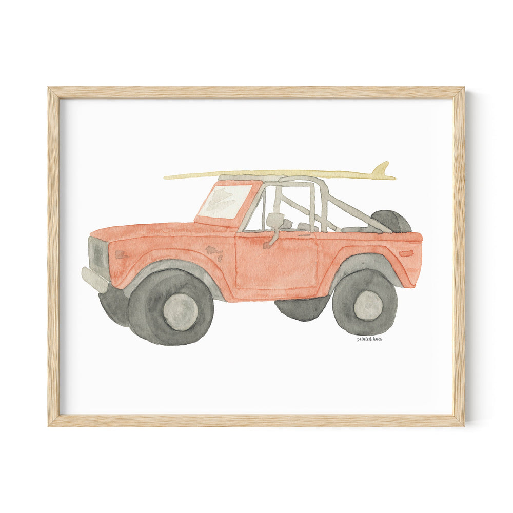 The Surf Truck Print is a professional reproduction of my original watercolor painting, inspired by vintage vehicles carrying surfboards.