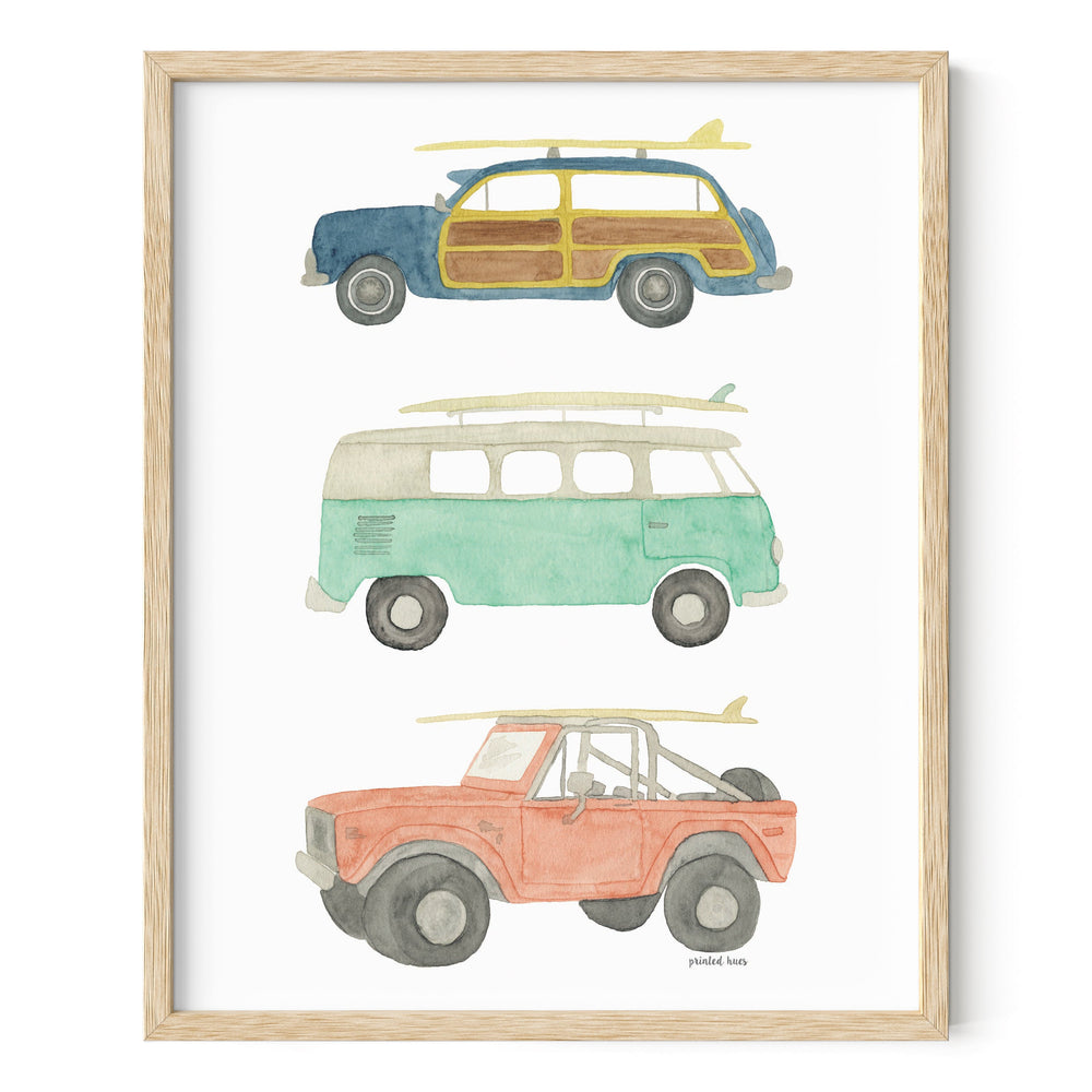 The Surf Truck Print is a professional reproduction of my original watercolor painting, inspired by vintage vehicles carrying surfboards.
