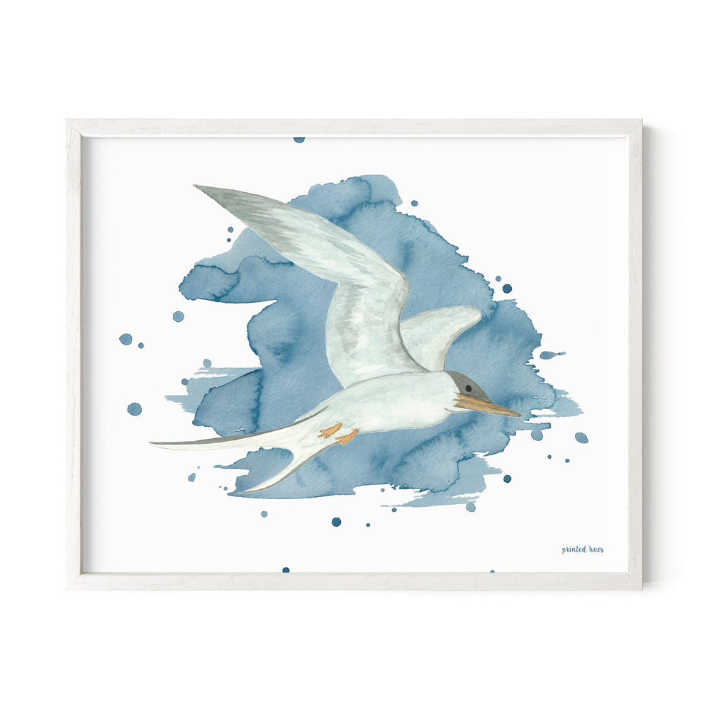 A tern (or sea swallow) soars over an abstract blue watercolor wash. Reproduced on beautiful, thick cotton paper, this giclee print looks like an original watercolor painting. Mixes and matches perfectly with the rest of the Bird Collection.